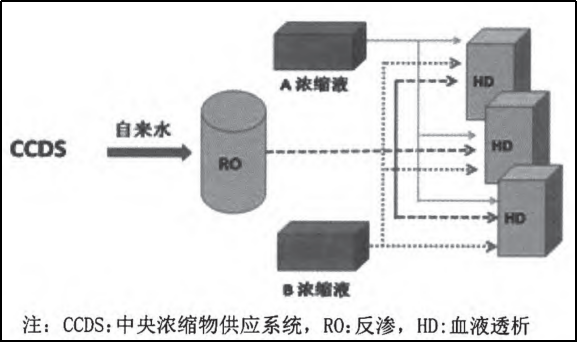 A、B粉經(jīng)過集中供濃縮液系統(tǒng)(Central Concentrate Delivery System,CCDS)溶解為濃縮液,經(jīng)過系統(tǒng)內(nèi)部一系列檢測,合格后通過專用管道將濃縮液輸送至透析機(jī)。