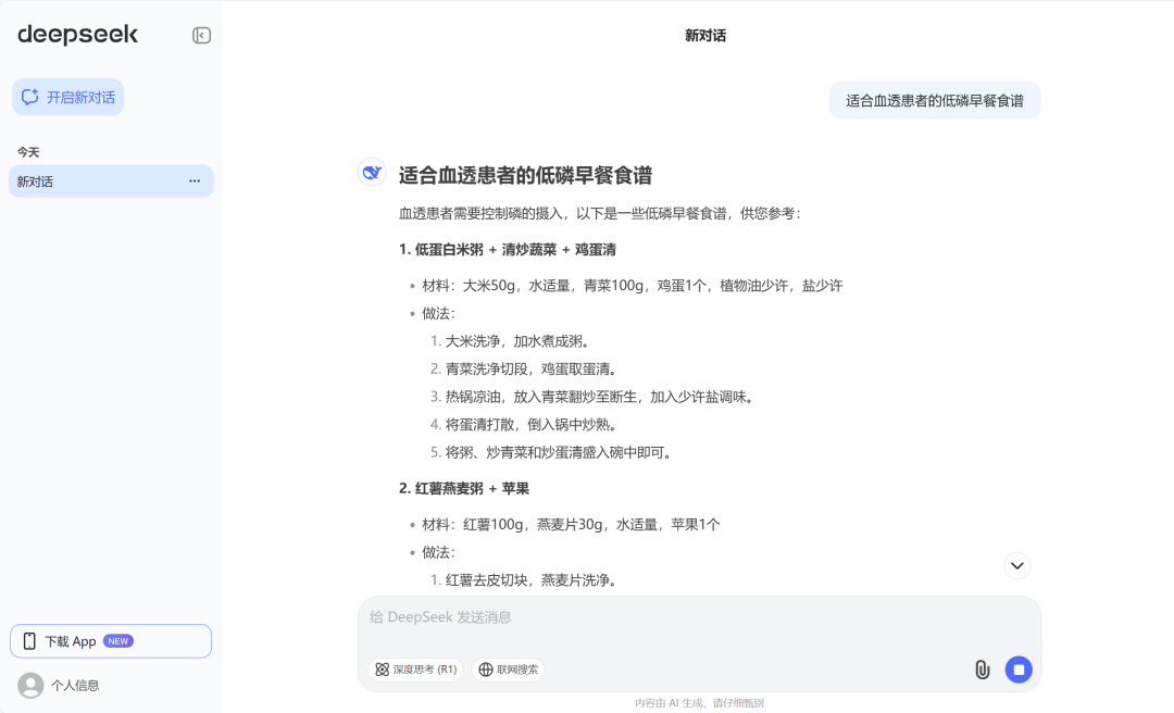例如,輸入“適合血透患者的低磷早餐食譜”,DeepSeek會生成多種食譜供你參考。
